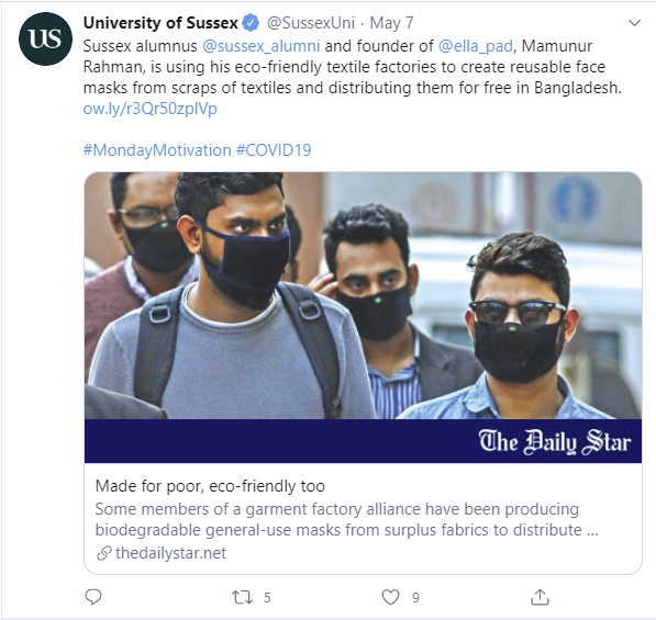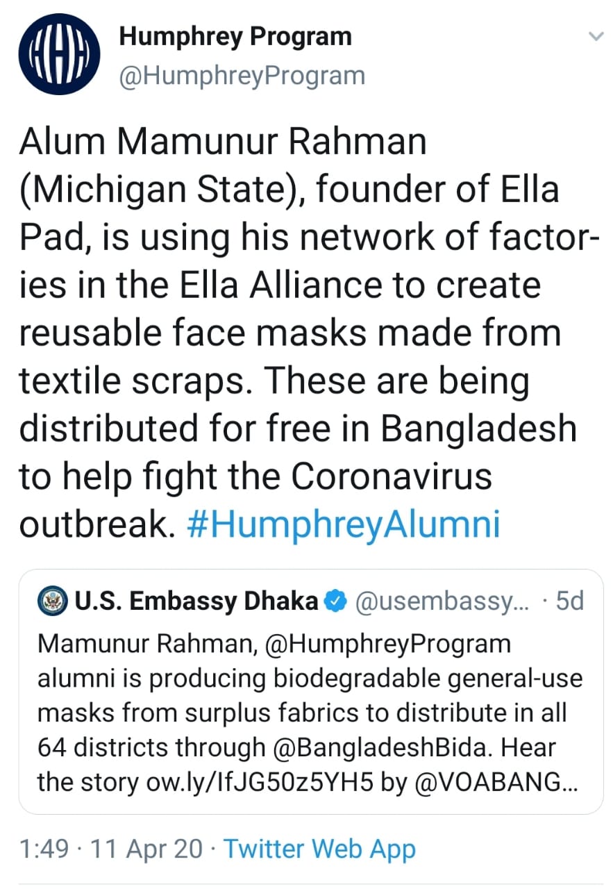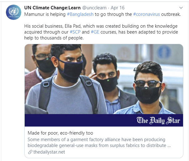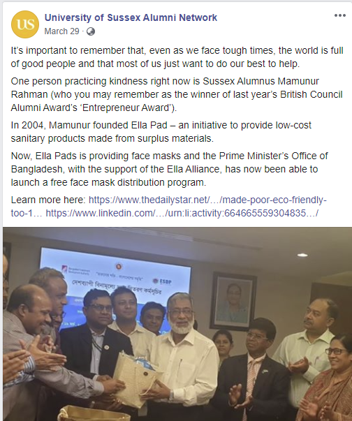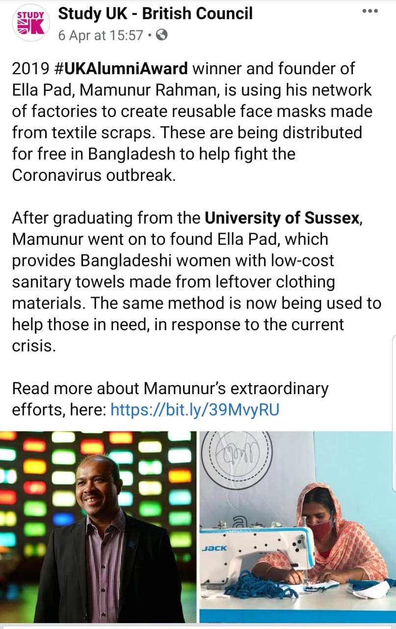 Mamunur, Founder of Ella Mask, is helping Bangladesh to go through the coronavirus outbreak. His social business, Ella Pad, has been adapted to provide help to thousands of people